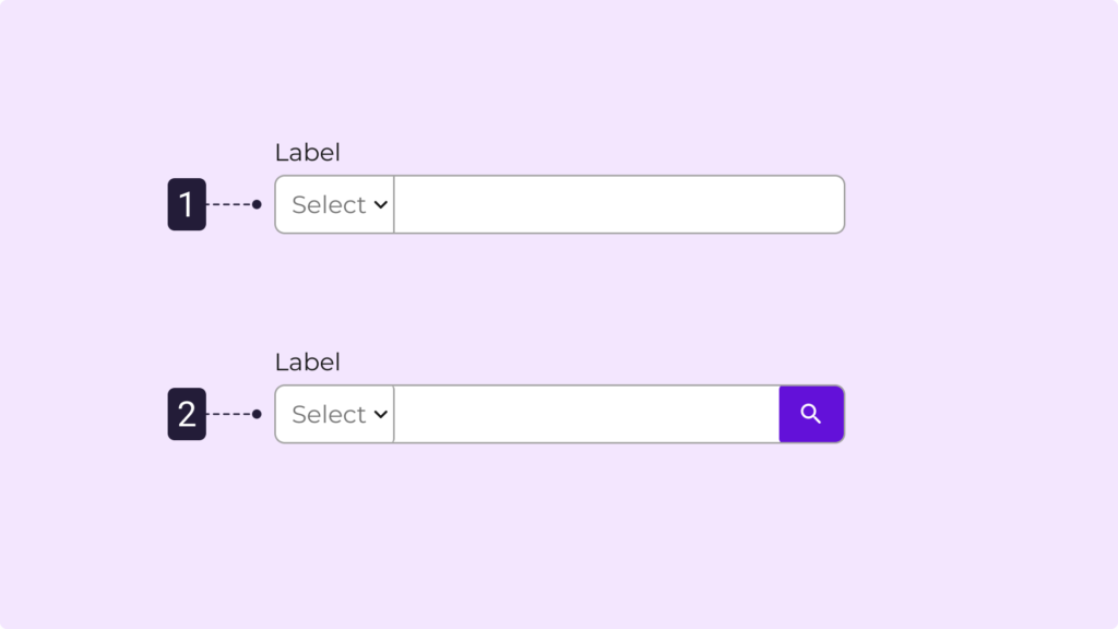 2. Selección + búsqueda: se usa cuando el usuario debe seleccionar un criterio y luego buscar información asociada a ese criterio. Recomendado para flujos donde la búsqueda depende del tipo de dato seleccionado.