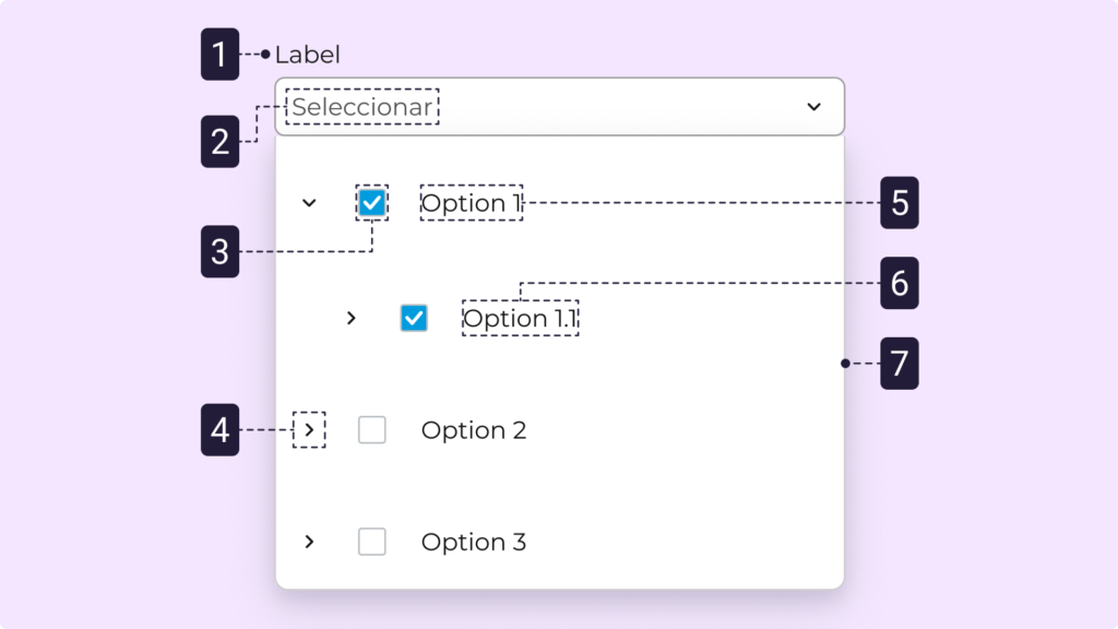 Este componente permite expandir y contraer nodos para visualizar subniveles y seleccionar elementos dentro de la jerarquía.